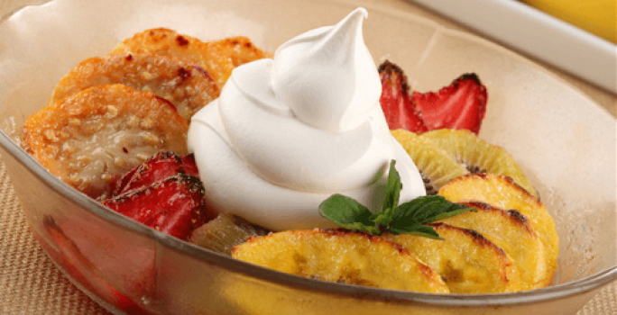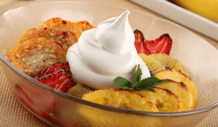 - 3.Retira del horno, cubre la fruta con CREMA DE LECHE NESTLÉ® y sirve.